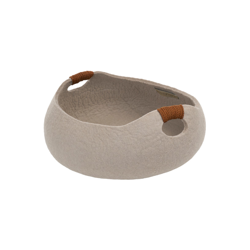 Mungo & Maud's Pebble Cat Bed is the sweetest place to nest.  This curious cave-like bed, carved out of wool felt, has bound handles to carry it from room to room... hence, your cat will only be a stone's throw away.